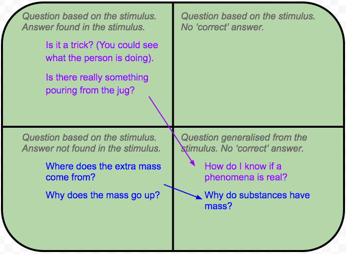 - Students generate questions. These were by my pupils: Where does the extra mass come from? Why does the mass go up? Is there really something pouring from the jug? Is it a trick? All of these are important questions that a teacher should want their pupils to be asking. They are useful for addressing misconceptions later.