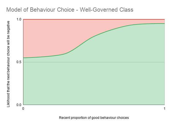 The basic idea is this: there are two equilibrium behaviour states in the classroom, either you are having a run of positive behaviour choices, or a run of bad choices. It is tricky to get from one state to the other. If you are in a run of positive behaviour choices (pupils working hard, contributing to discussions etc.), one or two negative behaviour choices won’t tip the lesson over the edge. Conversely, if you are in a run of negative behaviour choices (calling out, talking, being silly), it will take more than a couple of positive behaviour events to turn the class around.