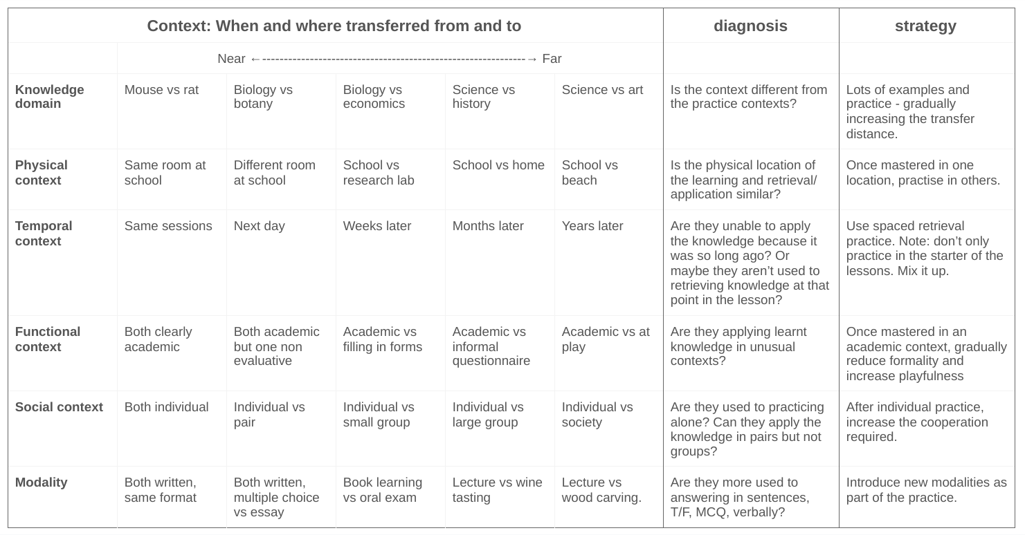 There is a useful taxonomy for transfer by Barnett, S. M., & Ceci, S. J. (2002) (see below). I’ve added two columns: one to suggest questions you might ask yourself about the cause of an incorrect response and another to suggest strategies for addressing it.
