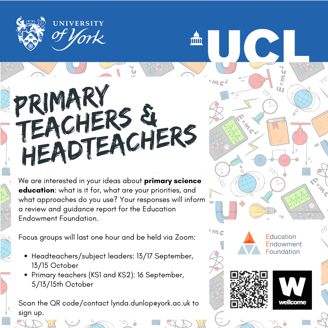 The first stage is to get the views of primary colleagues. The team is running focus groups (online) to understand what is important, how it is taught, and what ought to be prioritised in primary science. Taking part would mean a one hour conversation with a small group of other teachers. It will take no more than an hour. Different time slots are available you can see them and sign up here, or get in touch with lynda.dunlop@york.ac.uk for more information.