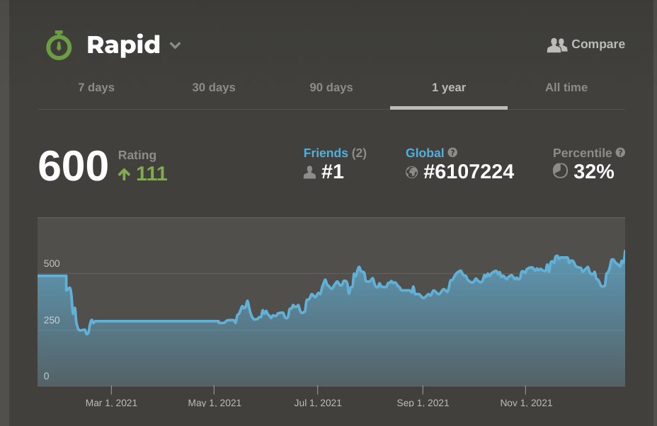 I joined chess.com exactly a year ago, and today (with a lot of effort) I finally achieved a rating of 600. That puts my just in the bottom third of all players on chess.com – or about the six millionth in their world ranking. For perspective, an average chess club player has a rating of about 1500. (I joined a club briefly in October – the players there were lovely and encouraging, but i decided to practise some more before returning).