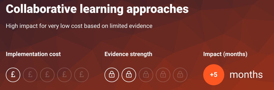 If we are serious about evidence informed teaching and learning, why aren’t we using collaborative learning in our classes? There is decent evidence that pupils working together in well structured collaborative learning activities has a strong learning effect.