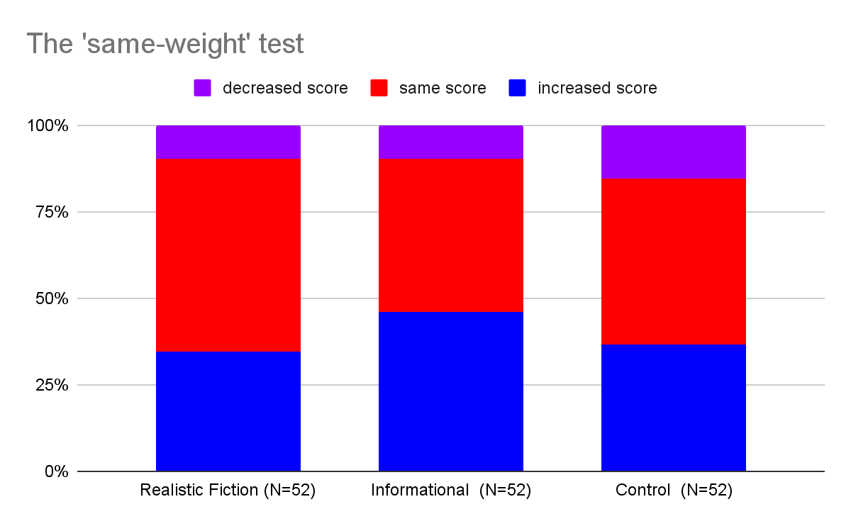 However, in the different-weight test, the texts make a big difference. The correct answer, that both objects will land at the same time, is counter intuitive. You can see that for the control group, reading an unrelated text made very little difference to the outcome. But both the informational and the realistic fiction tests, around half of the children improved their scores.