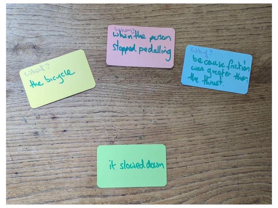 - When the person stopped pedaling, the bicycle slowed down because friction was greater than the thrust.