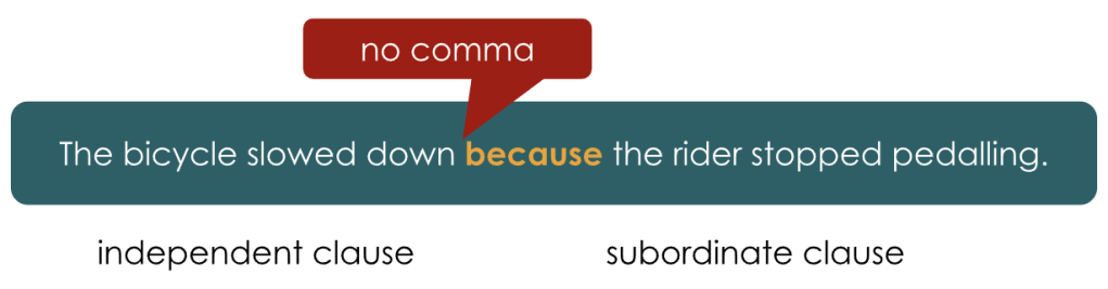 You can see from the three examples above, you don’t need to put a comma if the conjunction separates the clauses – the reader knows the clauses are separate because of the conjunction. However, if the conjunction is not between the two clauses, but at the start of the sentence, the reader needs the comma to know the clauses are separate.