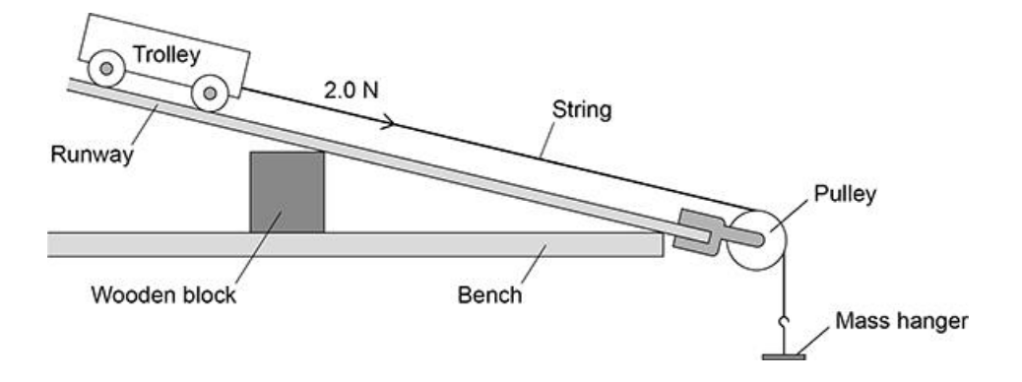 As the runway gets steeper, the force provided by the string does not change, however, the forward force due to gravity increases. So the total forward force increases. Therefore, the steeper the runway, the greater the acceleration.